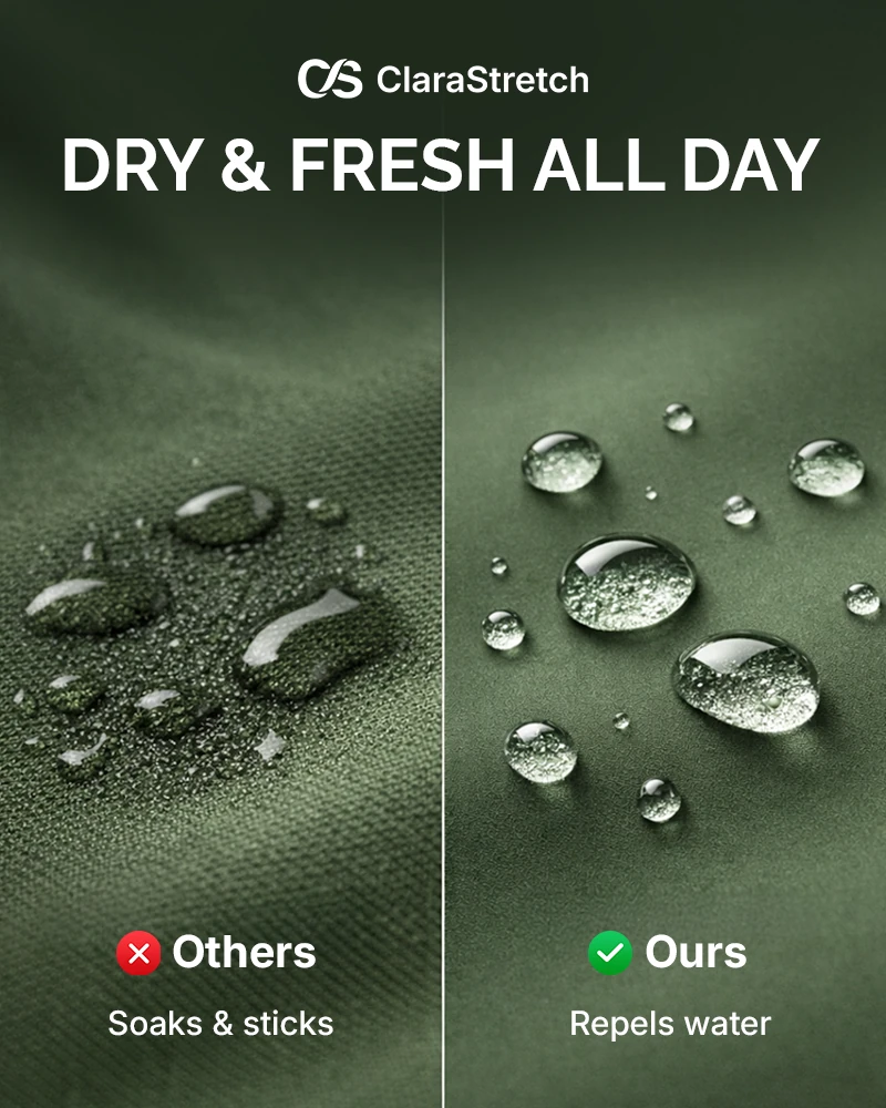 Why settle for pants that soak, stick, and judge you for having an active life? While "other" fabrics stay soggy and heavy, ClaraStretch repels the mess and stays bone-dry.
